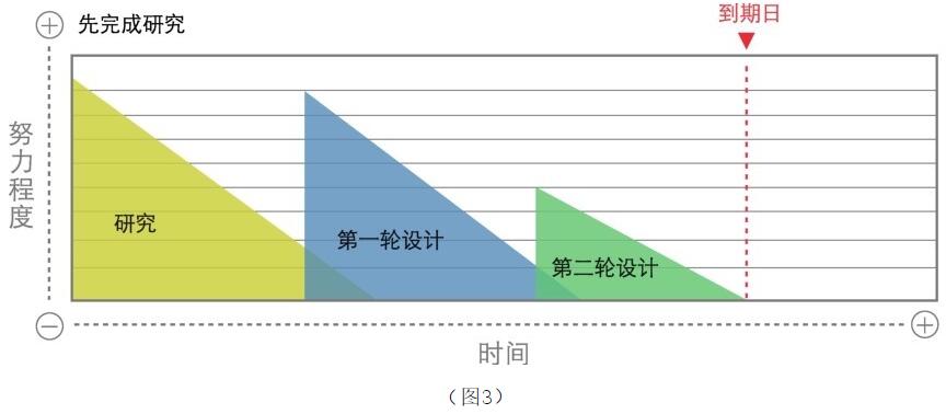 顯示了這個(gè)過程應(yīng)該是怎樣工作的。在設(shè)計(jì)工作開始之前,即便沒有完成所有的研究工作,也要完成絕大多數(shù)必要的研究,這意味著一個(gè)相當(dāng)明確的設(shè)計(jì)周期,設(shè)計(jì)師要明確并清晰地認(rèn)識(shí)到所有需要解決的問題。第一回合的設(shè)計(jì)通常都需要一些改進(jìn),這樣安排便于隨時(shí)對(duì)照項(xiàng)目時(shí)間表,隨時(shí)進(jìn)行調(diào)整,讓整個(gè)團(tuán)隊(duì)成員都感覺到項(xiàng)目的每個(gè)環(huán)節(jié)處于可控范圍內(nèi)。(圖4)