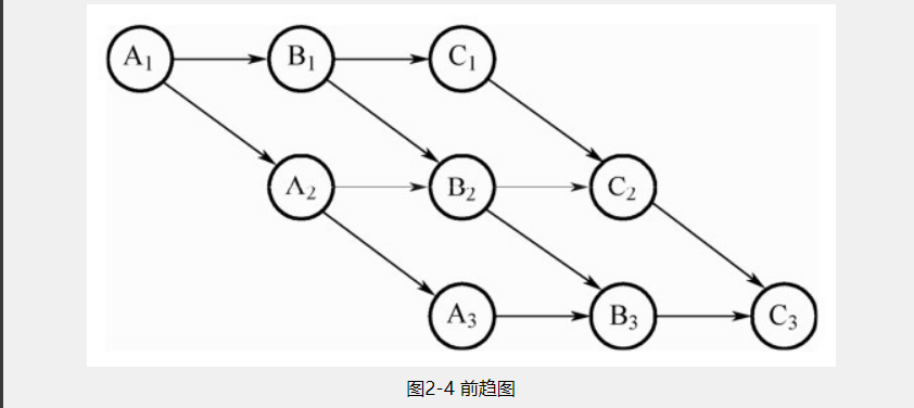 在前趨圖中,執(zhí)行先后順序的制約關系可分為兩種:直接制約和間接制約。直接制約通常是指一個操作中,多個步驟之間的制約關系,也可以說是“同步的進程之間的制約關系”。如圖2-4所示,A、B,、C,是一條指令的取指、分析、執(zhí)行的三個步驟,所以它們之間的關系是直接制約。