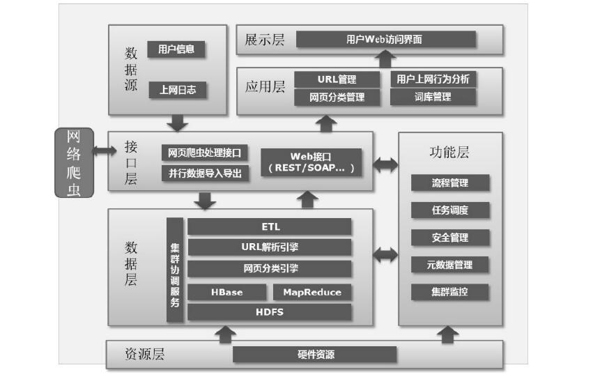 接口層負責與外部系統(tǒng)的數(shù)據(jù)進行交換,包括用戶數(shù)據(jù)、上網(wǎng)日志數(shù)據(jù)的采集,互聯(lián)網(wǎng)網(wǎng)頁內(nèi)容的爬取和對外圍系統(tǒng)提供訪問接口。數(shù)據(jù)接口可實現(xiàn)對關系型數(shù)據(jù)庫,如Oracle、DB2等的數(shù)據(jù)交換,包括采集和加載過程,同時也支持文件類型的數(shù)據(jù),可以通過FTP等方式進行采集。系統(tǒng)對外提供統(tǒng)一訪問接口,具有開放性、高性能、可監(jiān)控管理和安全性等特征。