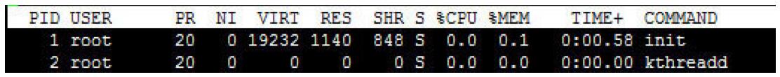 繼續(xù)返回top命令的講解,下面這行是進(jìn)程統(tǒng)計(jì)信息區(qū),顯示了各個(gè)進(jìn)程的詳細(xì)信息,如圖4.3所示。