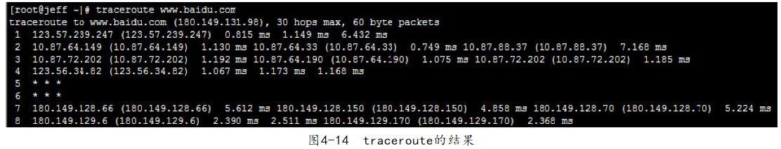 traceroute這個(gè)命令在生產(chǎn)環(huán)境中用得最多的場景是某個(gè)用戶反饋無法訪問后臺,但其他用戶訪問正常。這時(shí)最好讓有定技術(shù)基礎(chǔ)的用戶運(yùn)行traceroute命令來查看訪問后臺的過程中哪個(gè)地方出了錯(cuò)。使用traceroute的結(jié)果如圖414所示