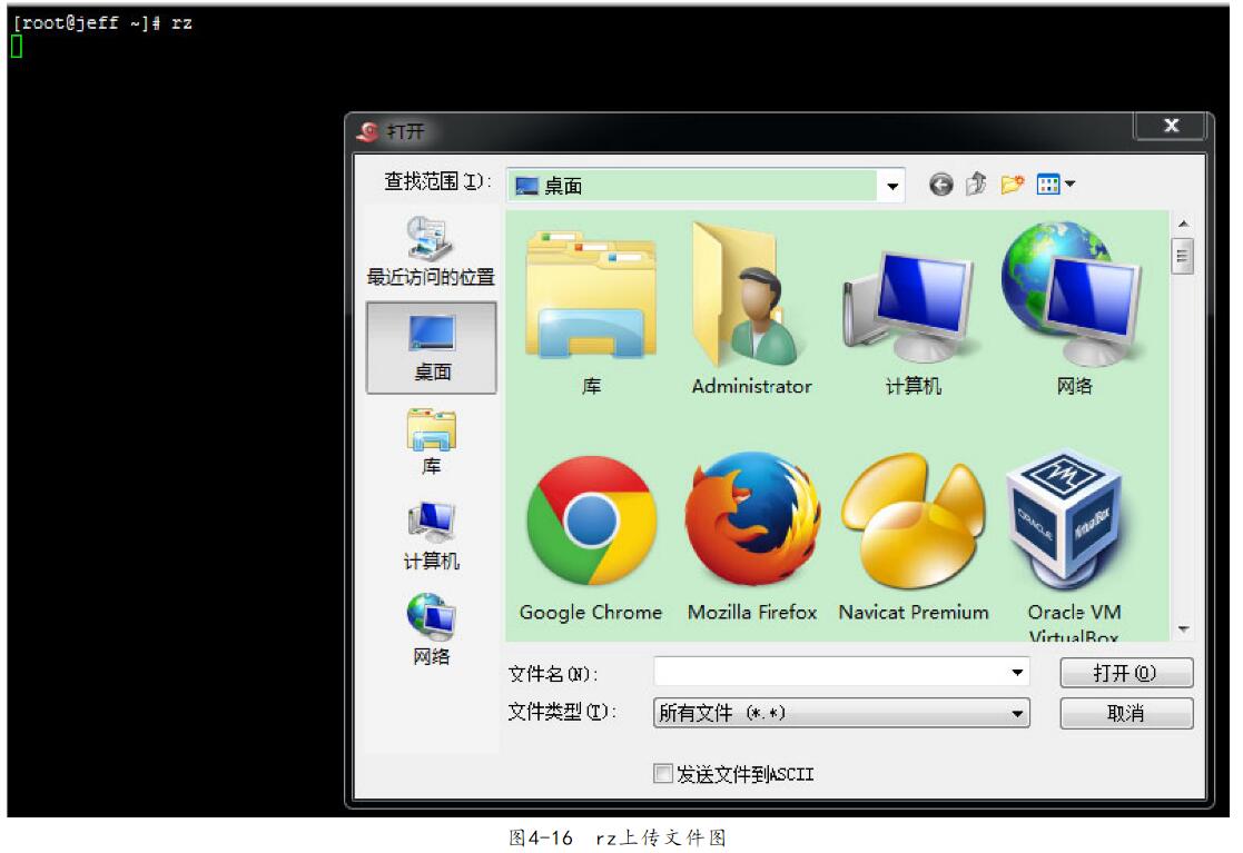 用戶往Linux服務(wù)器上傳文件的時(shí)候,在目標(biāo)文件夾執(zhí)行命令“rz”,在ssh客戶端彈出個(gè)窗口讓用戶選擇上傳的文件,如圖4-16所示