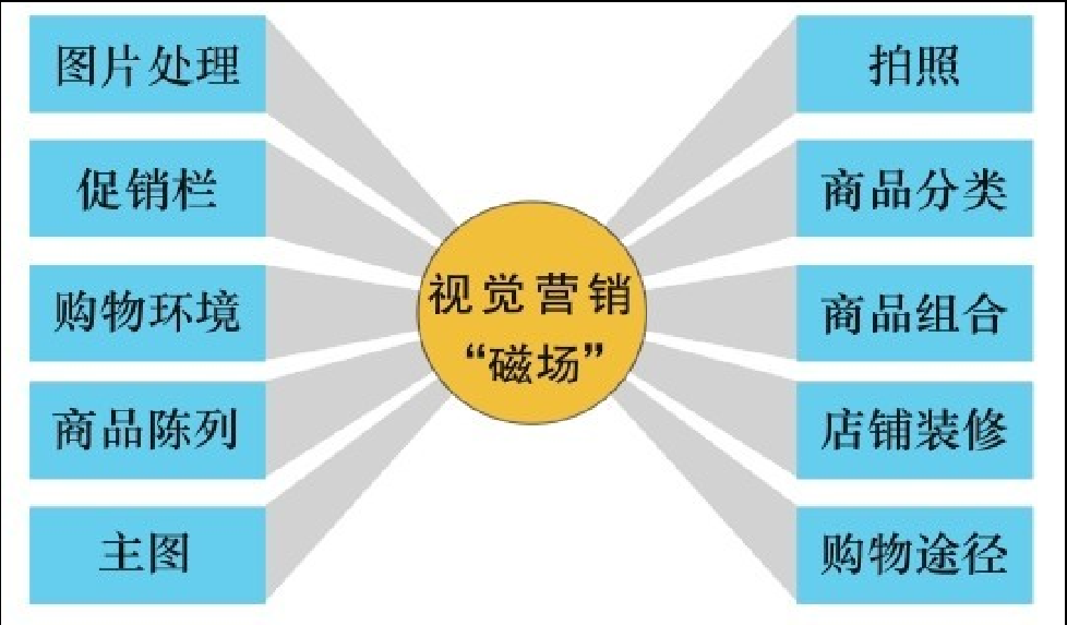 移動電商進(jìn)行移動視覺營銷,就是通過標(biāo)志、色彩、圖片、廣告、櫥窗、陳列等一系列視覺展示手段,向消費者傳遞商品信息、服務(wù)理念和品牌文化,從而打造出一個圖1-1所示的有吸引力的“磁場”,達(dá)到促進(jìn)商品銷售、樹立品牌形象的目的。隨著市場競爭越來越激烈,視覺營銷將成為各種營銷方式中的一種核心方式。