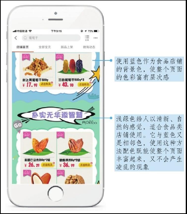 選擇同類(lèi)色的顏色搭配,并不表示顏色毫無(wú)變化,可以通過(guò)調(diào)整色彩的透明度和飽和度使單一色彩深淺有別。某店鋪的主色(即在頁(yè)面中占據(jù)面積最大、具有主導(dǎo)作用的色彩)是黃色,輔助色為土黃色,整個(gè)頁(yè)面看起來(lái)色彩統(tǒng)一,又有層次感,如圖2-3所示