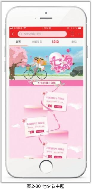 人們對于一個店鋪色彩的記憶往往更傾向于其包裝,包裝本身也代表著整個店鋪的風格定位。色彩有著自己的語言,可以喚起人們的心靈感知,所以在確定移動端店鋪主題色調(diào)時,應該注意與商品特性相符合,或與目標消費群體的特性相符合。如果店鋪主營18~30歲的女性時尚服飾,那么比較適合的主題色就是偏粉色、紅色的柔和浪漫色系,如圖2-31所示;如果店鋪主營手機、相機等數(shù)碼類產(chǎn)品,那么藍色、黑色和灰色系往往會給消費者以理智、高貴、沉穩(wěn)的感覺,如圖2-32所示。