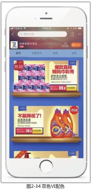 在移動端店鋪中,雙色Ⅵ配色方案如圖2-34所示。店鋪Logo由兩種顏色組成,以其中一種顏色作為店鋪的主色,另一種顏色作為輔助色。
