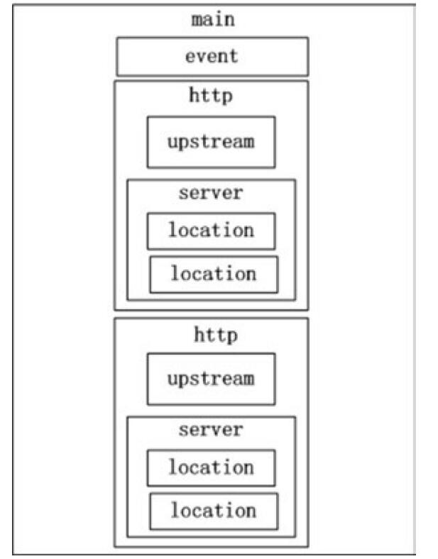 Nginx的配置文件nginx.conf是純文本書件,位于Nginx安裝目錄的couf目錄下,整個配置文件是以塊的形式組織。每個塊以“{}”來表示,采用嵌套的方式,一個大塊中可以包括小塊。最大的塊是mnain塊,maln塊里包含event塊和http塊.http塊包含了upstre砌塊和server塊.server塊包含了多個location塊,整個配置文件的結構如圖5-3所示。