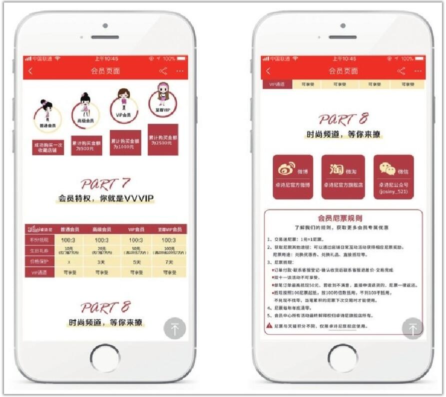 在當今這個高速運轉(zhuǎn)的互聯(lián)網(wǎng)時代,碎片化信息的傳播已經(jīng)逐漸改變了人們的閱讀習慣,相對于大段的文字說明而言,人們更喜歡快速與輕松的閱讀方式。特別是對于在移動端進行網(wǎng)購的消費者而言,他們本來就在享受悠閑的購物時光,根本無法靜下心來仔細研究文字信息過多的會員制度,因為他們期望獲得的是快樂與放松的情感體驗。因此,賣家需要將大段文字歸納成要點,然而過多的要點也可能會呈現(xiàn)出擁堵的表現(xiàn)形式,此時結(jié)合圖形進行說明能夠更加直觀地給消費者呈現(xiàn)他們需要看到的信息。