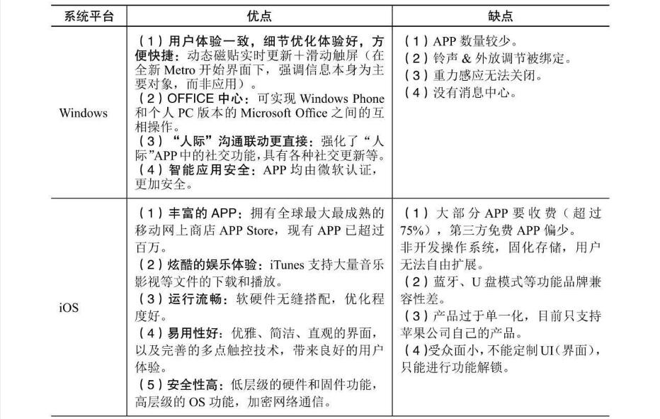 表1.1三大手機(jī)系統(tǒng)平臺(tái)的優(yōu)點(diǎn)和缺點(diǎn)對(duì)比