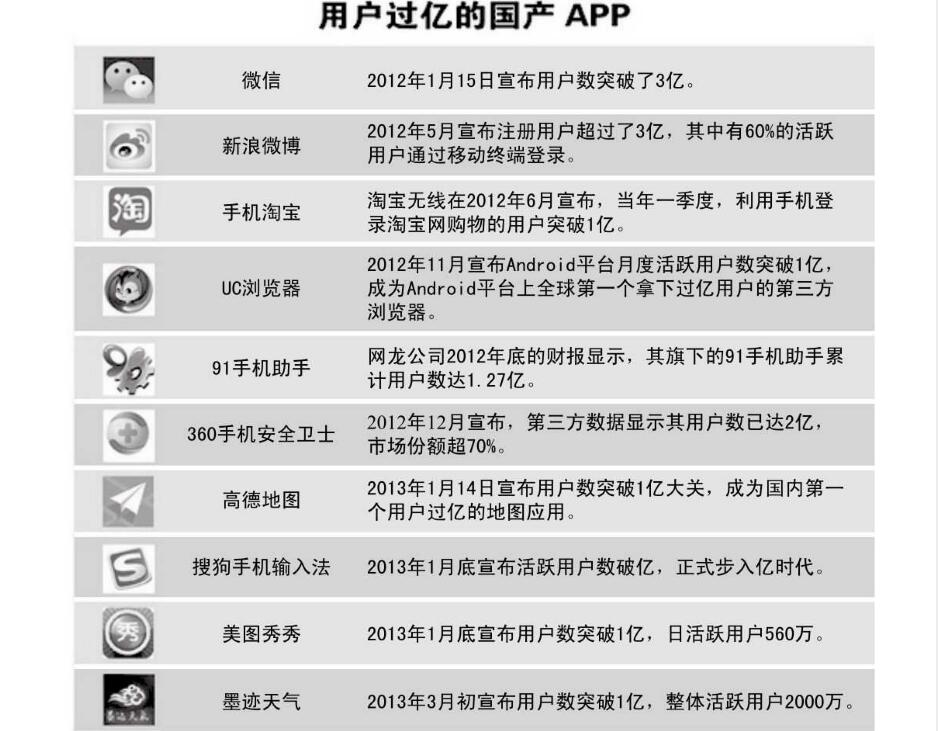 目前,擁有過(guò)億用戶的移動(dòng)應(yīng)用已達(dá)10款左右,包括微信、新浪微博、手機(jī)淘寶、 UC瀏覽器、搜狗輸入法、91手機(jī)助手、360手機(jī)安全衛(wèi)士、高德地圖、美圖秀秀及墨跡天氣等,