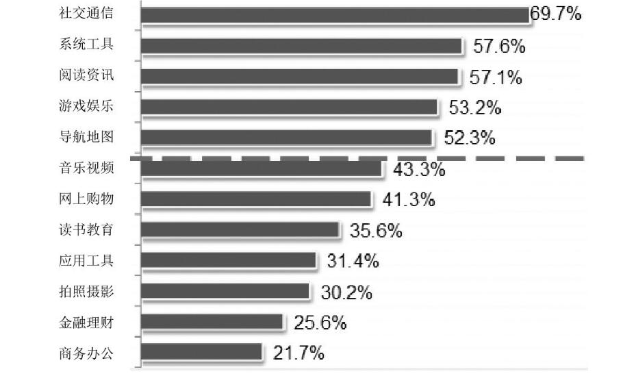 現(xiàn)在,APP應(yīng)用逐漸開(kāi)始呈現(xiàn)多元化的發(fā)展趨勢(shì),目前在市面上出現(xiàn)社交通信、系統(tǒng)工具、閱讀資訊、游戲娛樂(lè)、導(dǎo)航地圖、音樂(lè)視頻、網(wǎng)上購(gòu)物、讀書教育等多種類型的APP應(yīng)用,其中社交通信、系統(tǒng)工具、閱讀資訊、游戲娛樂(lè)和導(dǎo)航地圖是較常使用的APP功能,