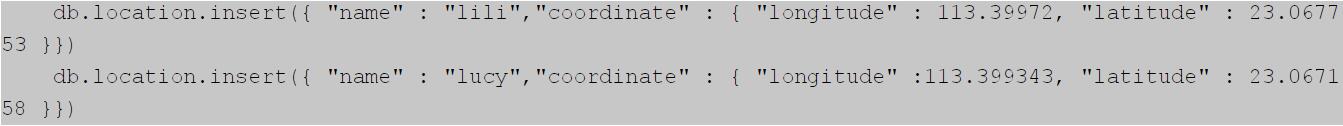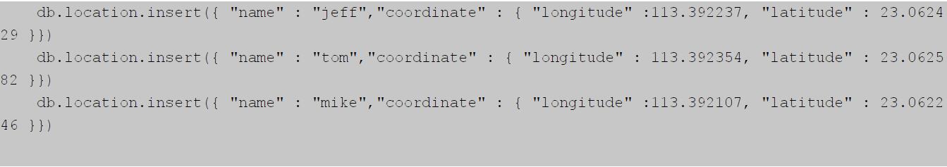基于LBS的App,必不可少的一個功能是根據(jù)當(dāng)前用戶的位置查找附近范圍內(nèi)的人或物。這些App的數(shù)據(jù)中部包含了地理位置信息,而如何處理、分析、存儲這些地理位置信息,則是LBS技術(shù)的個關(guān)鍵點(diǎn)。關(guān)于LBS技術(shù)的詳細(xì)分析,可查看深圳APP開發(fā)公司本站LBSApp后臺架構(gòu)”這一篇文章。因?yàn)镸ongoDB封裝了LBS常用的操作全球流行的LBS應(yīng)用foursquare,國內(nèi)的快的打車和滴滴打車(現(xiàn)在這兩家公司己合并)都曾經(jīng)選擇TMongoDB處理LBS。APP開發(fā)公司程序員將在本節(jié)中將演示如何使用MongoDB處理LBS。首先在MongoDB中插入地理位置的數(shù)據(jù)示例如下: