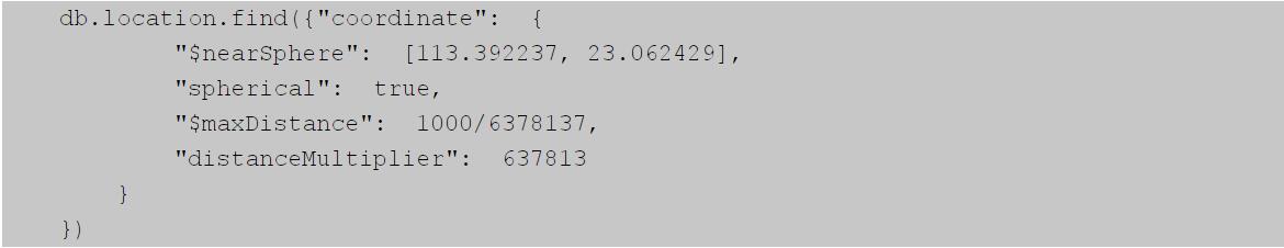下面的語句表示查找集合location中,和坐標(biāo)[113.392237,23062429]的間距在l千米范圍內(nèi)的坐標(biāo)。