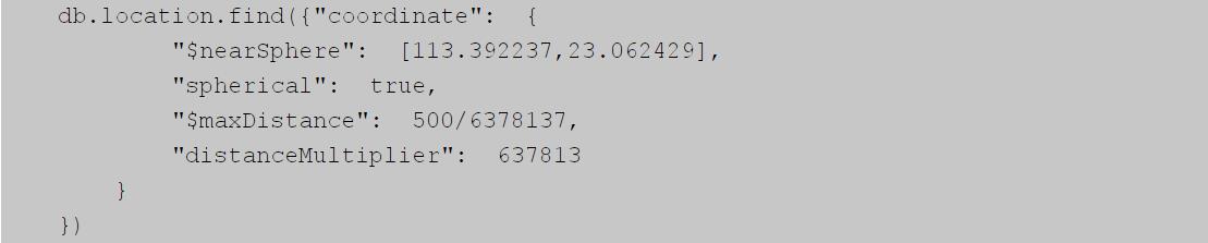 上面“spherical”為true表示計算距離,distanceMultiplier指定地球半徑來得到實(shí)際的千米或者米的距離,“1000/6378137”就是把距離轉(zhuǎn)化為弧度。