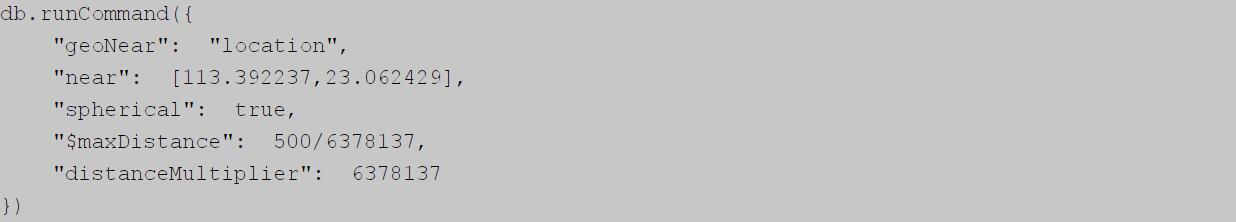 這個需求和前面的查找附近的人很相近,但是返回結(jié)果需要包含距離,MongoDB提供了geoNearmm命令來解決這個需求。geoNear的返回結(jié)果中包含了距離的信息。geoNear命令是基于db的command,而不是基于collection的find,也就是需要通過runcommand執(zhí)行。在查找集合location中,和坐標(biāo)113.392237,23.062429]的間距在500米范圍內(nèi)的坐標(biāo),同時顯示和目標(biāo)坐標(biāo)的距離,整個命令如下:
