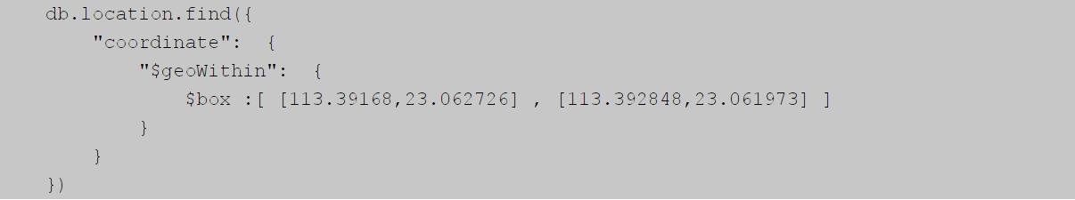 定義一個矩形范圍的范圍,根據(jù)圖8-13指定矩形個對角的坐標(biāo)“113.39168,23062726”、“113.392848,23061973”,使用如下的查詢語句就能查找location集合中矩形區(qū)域內(nèi)的坐標(biāo):