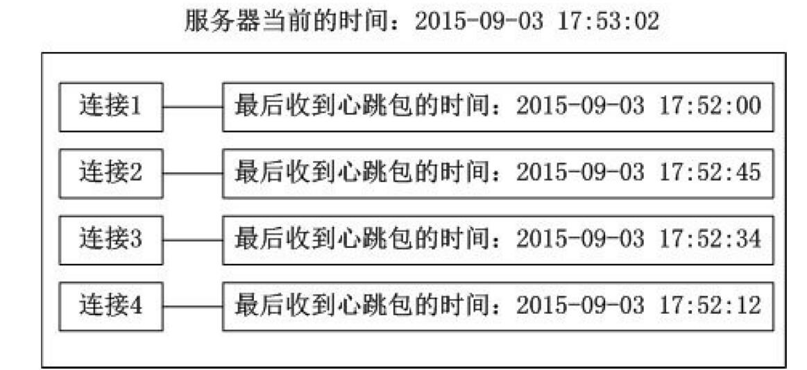 (1)服務器記錄每個連接收到心跳包的最后時間,每隔一段時間檢查所有連接,如果發(fā)現某個連接最后收到心跳包的時間減去當前時間的值大干超時時間,就把那個連接斷開。如圖9-3所示,服務器的當前時間為“2018-09-03 17:53:02”,各個連接最后收到心跳包的時間如下。