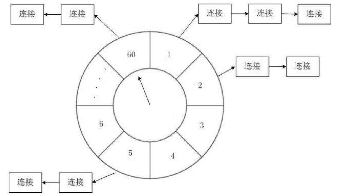(3)這種方式是(1)和(2)的折中,稱為時間輪片(Timing Wheel)。按照超時時司的長短,每秒設置一個桶,如果超時時間為60秒就設置60個桶.60個桶組成個循環(huán)隊列。第一個桶欣秒后將要超時的連接,第二個桶欣兩秒后將要超時的連接,每個連接收到心跳包就把自己放在第60個桶,然后在每秒的定時器中把第個桶的所有連接斷開,把這個空桶挪到隊尾。時間輪片的模型如圖9-7所示。
