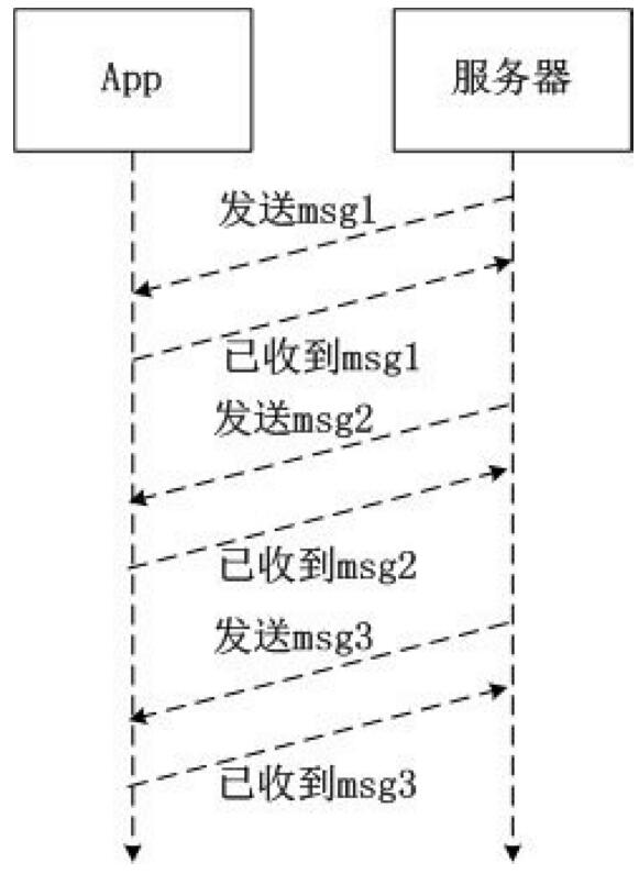 服務(wù)器按順序把消息隊列中的消息依次發(fā)送給客戶端,當客戶端收到消息后給服務(wù)端發(fā)送“確認收到”的應(yīng)答。如果過了一段時間服務(wù)器還沒收到客戶端的應(yīng)答,就重發(fā)該條消息。服務(wù)器與客戶端之間的消息交互過程如圖9-10所示