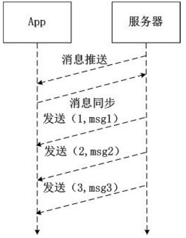 在圖9-11中,當服務(wù)器準備推送消息給App時,服務(wù)器向App發(fā)送“消息推送”消息,App收到這個信息向服務(wù)器返回“消息同步”消息(附上最后收到的消息版本號),服務(wù)器根據(jù)這個版本號,把大于該版本號的所有消息按照版本號依次推送給App。