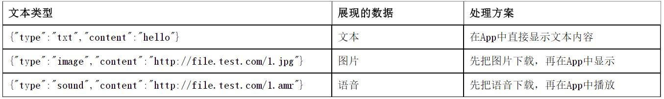 (2) App聊天模塊對接收到的下面幾種文本類型的數(shù)據(jù)做不同的處理,如下所示。