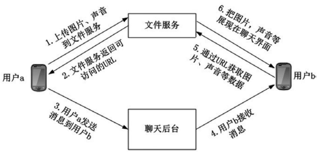 (1)假設(shè)用戶a向用戶b發(fā)送了張圖片,發(fā)送前App先把該圖片上傳到文件服務(wù)器后得到個可訪問的URL: http://file. test. com/l.Jpg.