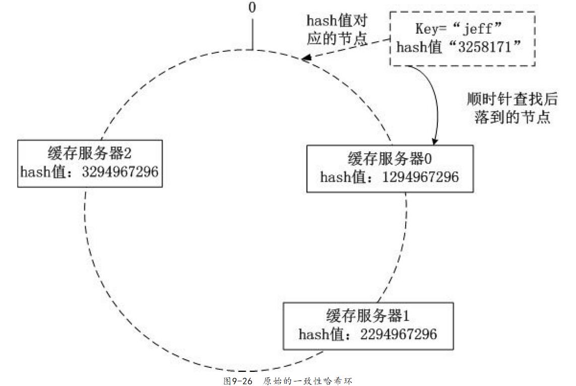 APP開發(fā)公司下面舉個(gè)例子說明一致性哈希算法的工作流程。在一致性哈希環(huán)下,存在3臺(tái)緩存服務(wù)器的情況,Key值是“jeff”的數(shù)據(jù)命中緩存服務(wù)器的情況如圖9-26所示。