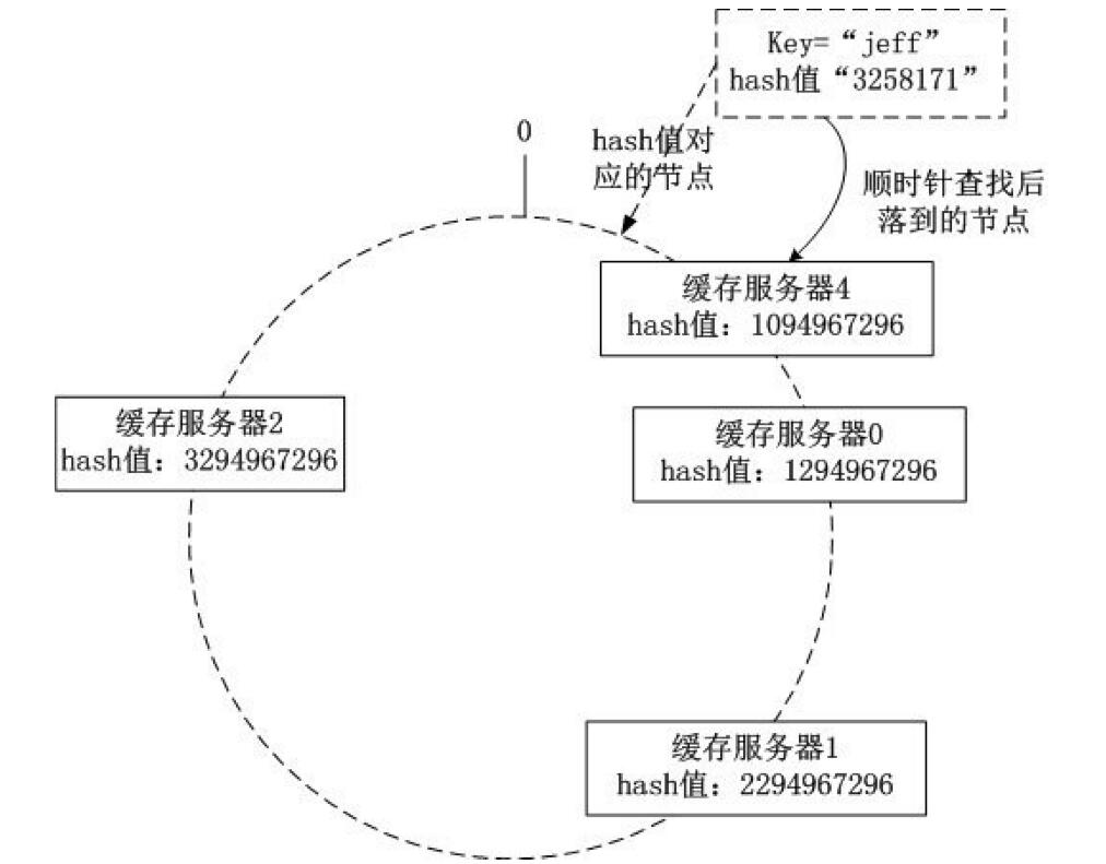 上面兩個(gè)問題可用余數(shù)hash的方案解決:用服務(wù)器的數(shù)量除以緩存數(shù)據(jù)的Key的hash值,余數(shù)為對(duì)應(yīng)的緩存服務(wù)器的下標(biāo)編號(hào)0例如,對(duì)于Key為“jeff”的數(shù)據(jù).hash值(Java的hashCode返回值)為3258171,用服務(wù)器數(shù)目3除以該值,得到余數(shù)0,因此該數(shù)據(jù)存儲(chǔ)在“緩存服務(wù)器O”。
