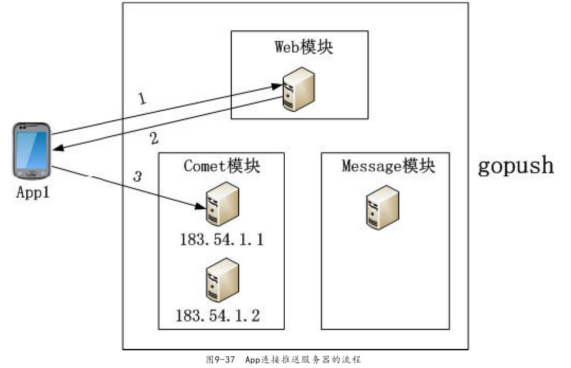 (3) App從返回的JSON數(shù)據(jù)中得到Comet模塊的IP,使用Comet模塊的協(xié)議格式連接到Comet模塊,這樣App就成功連接了推送服務(wù)器App連接推送服務(wù)器的流程如圖9-37所示。