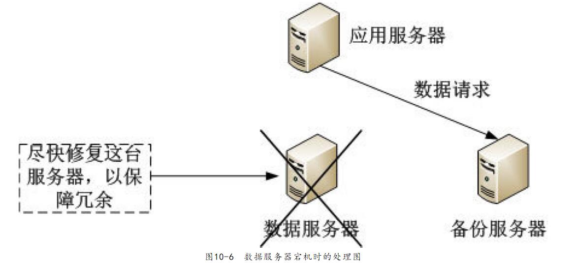 檢測到數(shù)據(jù)服務器宕機,把數(shù)據(jù)的請求切換到備份服務器,同時盡快修復宕機的服務器,如圖10-6所示。