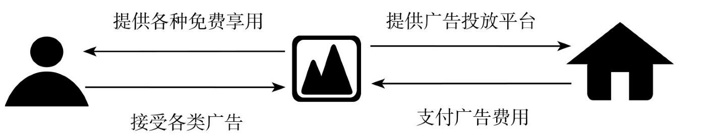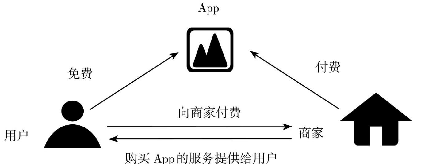 現(xiàn)在越來越多的App正以廣告補貼的形式去獲利,這也是當(dāng)前應(yīng)用最廣泛的一種模式。App借助高人氣、娛樂性強的特點,合理植入廣告信息,并結(jié)合產(chǎn)品屬性和廣告定位,優(yōu)化App應(yīng)用。就容易達到廣告主、應(yīng)用開發(fā)者和用戶三方共贏的效果,既有助于品牌與消費者建立良好良好的互動關(guān)系,也有利于加深用戶體驗。這種模式下個人用戶無需付費,但必須忍受App中鑲嵌的各種廣告,廣告主要來源于各類商家,同時需要向App支付不同額度的廣告費用,如圖2-19所示。