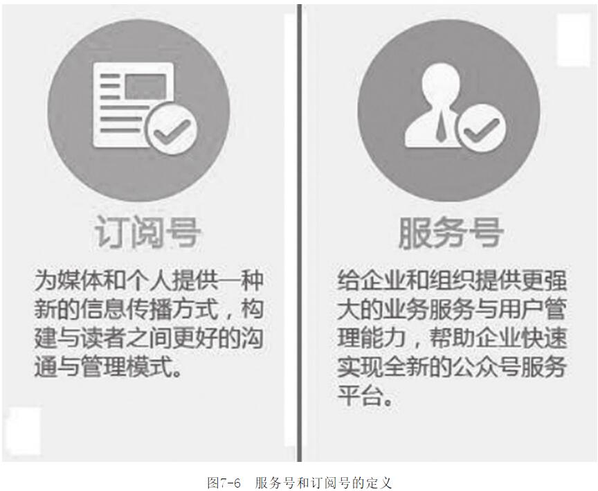 (1)微信公眾號的類型微信5.0后,微信公眾平臺最大的改變就是有了服務(wù)號和訂閱號之分。服務(wù)號,顧名思義,主要是給客戶提供服務(wù)的,銀行、服務(wù)型企業(yè)通常用的較多。訂閱號,主要是為用戶提供信息和資訊,各類媒體用得比較多。微信公眾平臺服務(wù)號和訂閱號的定義如圖7-6所示。