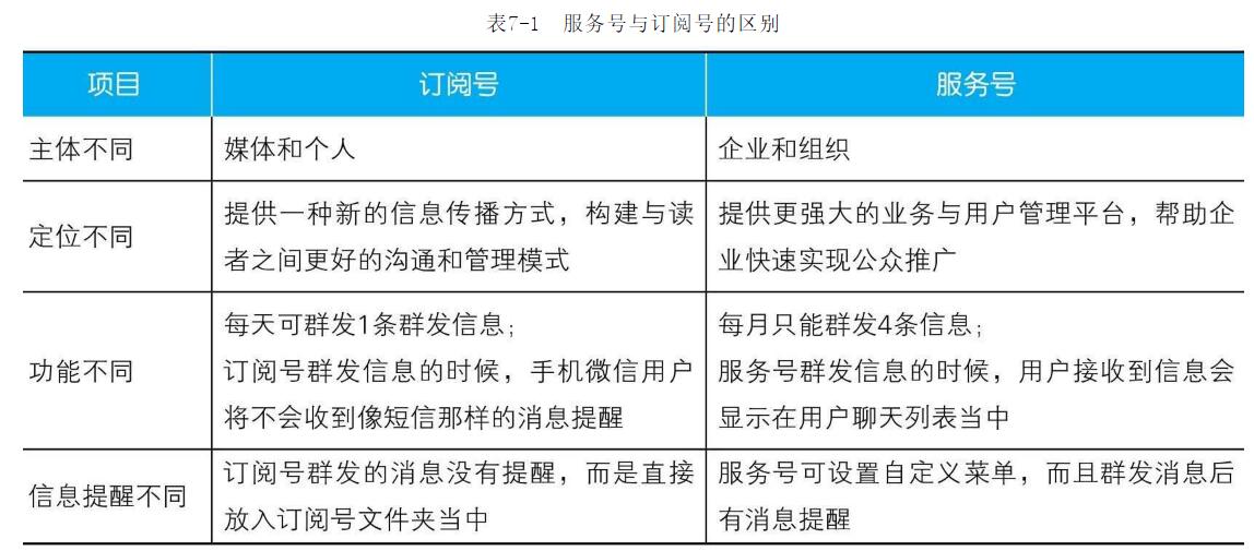 兩者同屬于微信公眾號但又有所區(qū)別,兩者的服務(wù)權(quán)限、針對的使用主體都有所不同。主要表現(xiàn)在以下4點(diǎn),如表7-1所列。