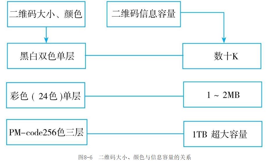 (1)信息容量大二維碼由于采用的是高密度編碼,小小的圖形中可以容納1850個(gè)大寫字母,或2710個(gè)數(shù)字,或1108個(gè)字節(jié),或500多個(gè)漢字。同時(shí),二維碼是一個(gè)多行、連續(xù)、可變長(zhǎng)、包含大量數(shù)據(jù)的符號(hào)標(biāo)識(shí),圖形的大小、顏色不同,容量也會(huì)有所差異。據(jù)悉,每個(gè)條碼有3~90行,每行都有一個(gè)起始部分、數(shù)據(jù)部分、終止部分。所以,二維碼是普通條碼信息容量的幾倍,甚至幾十倍。如此大的信息量,使二維碼具備了信息容量大的特點(diǎn),用戶通過(guò)掃描可獲取大量的信息。二維碼大小、顏色與信息容量的關(guān)系,如圖8-6所示。