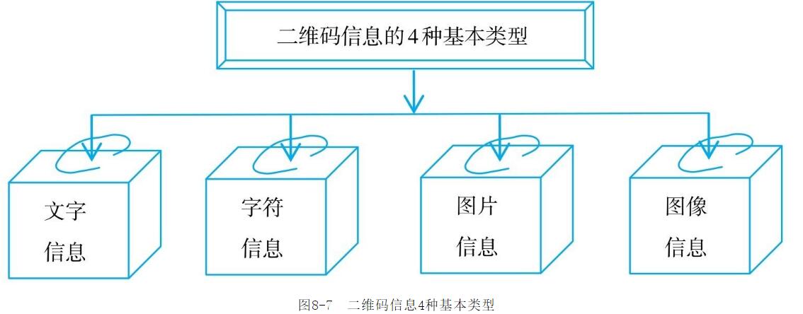 (2)表現(xiàn)形式多二維碼信息通常是以圖片、聲音、文字、簽字、指紋等多種形式進(jìn)行編碼,并可綜合性地表示出來(lái),如語(yǔ)言文字,圖像數(shù)據(jù)、可視視頻等。大多數(shù)情況下,二維碼信息的表現(xiàn)方式有4種最基本的類型,如圖8-7所示。