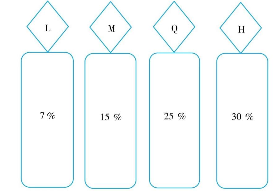 (5)容錯(cuò)率高容錯(cuò)率是指強(qiáng)糾錯(cuò)的能力,二維碼容錯(cuò)率即是指二維碼圖標(biāo)在被遮擋一部分后,仍可以被用戶掃描出來(lái)的能力。糾錯(cuò)的過(guò)程是指通過(guò)位置探測(cè)圖形來(lái)定位二維碼的區(qū)域,然后根據(jù)二維碼的編碼格式信息和糾錯(cuò)碼。如,被穿孔、污損、局部撕掉等,同樣可被正確識(shí)讀。損毀度最高可達(dá)30%。二維碼容錯(cuò)率可分為4個(gè)等級(jí),用字母分別表示為L(zhǎng)、M、Q、H,具體如圖8-9所示。