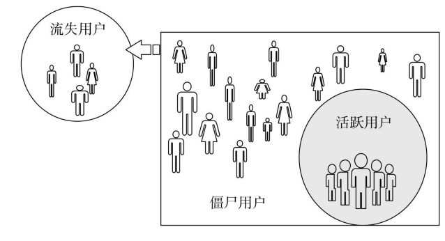 活躍用戶是相對于“流失用戶”“僵尸用戶”而言的,是指除了這兩類用戶之外的,且會時不時地光顧,并為App帶來價值的用戶,如圖1 所示。