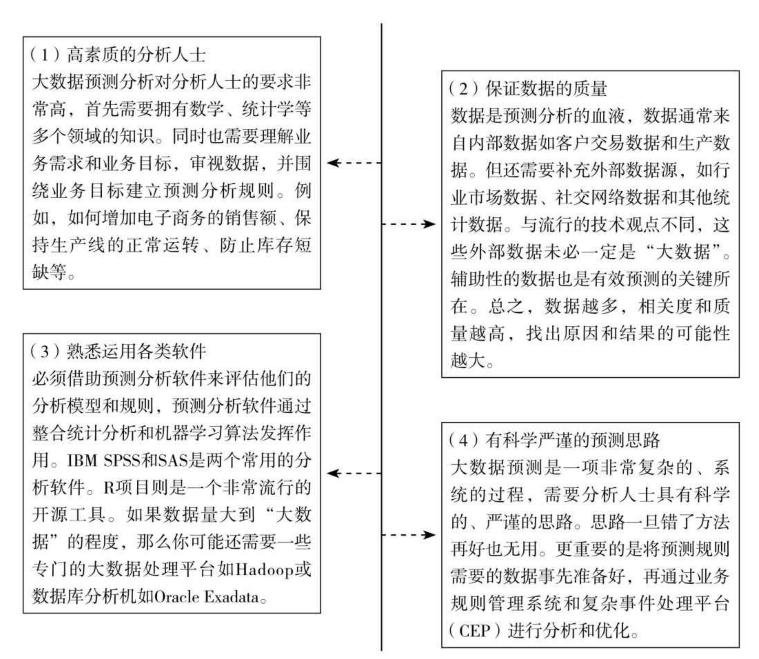 大數(shù)據(jù)預(yù)測(cè)分析(Big Data Predictive Analytics)是大數(shù)據(jù)分析中主要的一環(huán)。同時(shí),這也是大數(shù)據(jù)分析中一個(gè)極端困難的任務(wù),實(shí)施成功的預(yù)測(cè)分析非常困難,并非普通的分析人士所能完成的。做好大數(shù)據(jù)的預(yù)測(cè)性分析,需要具備以下四個(gè)條件。