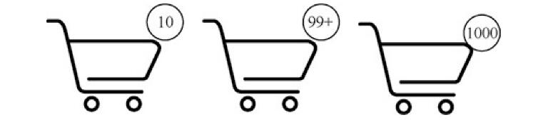 (8)在許多APP,尤其是電商APP中,會在購物車、訂單或消息圖標(biāo)的右上角設(shè)計一個數(shù)字角標(biāo),顯示購物車中的商品數(shù)量、訂單個數(shù)或消息個數(shù)。通常會把角標(biāo)區(qū)域設(shè)計成圓形,如果數(shù)量不到100時,可以正常顯示;超過99,變成3位或4位數(shù)時,往往就顯示不下了,此時有以下兩種解決方案。數(shù)字超過99時,顯示99+。改變角標(biāo)區(qū)域的形狀。如圖2-21所示,左邊的購物車?yán)镏挥?0個商品;中間購物車?yán)锏纳唐穫€數(shù)超過了99,就用99+表示;右邊購物車?yán)锏纳唐穫€數(shù)超過了100,達(dá)到了1000,把圓形角標(biāo)改成了橢圓形角標(biāo),以便完整顯示1000這個數(shù)字。