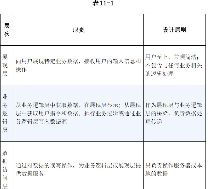 表11-1層次職責(zé)設(shè)計(jì)原則展現(xiàn)層向用戶展現(xiàn)特定業(yè)務(wù)數(shù)據(jù),接收用戶的輸入信息和操作用戶至上,兼顧簡(jiǎn)潔;不包含與任何業(yè)務(wù)相關(guān)的邏輯處理業(yè)務(wù)邏輯層從業(yè)務(wù)邏輯層中獲取數(shù)據(jù),在展現(xiàn)層顯示;從展現(xiàn)層中獲取用戶指令和數(shù)據(jù),執(zhí)行業(yè)務(wù)邏輯或通過(guò)業(yè)務(wù)邏輯層寫(xiě)入數(shù)據(jù)源作為展現(xiàn)層與業(yè)務(wù)邏輯層的橋梁,負(fù)責(zé)數(shù)據(jù)處理傳遞