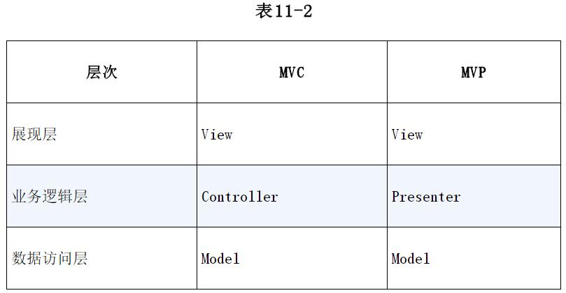 與MVC和MVP中各部分的對(duì)應(yīng)關(guān)系如表11-2所示。