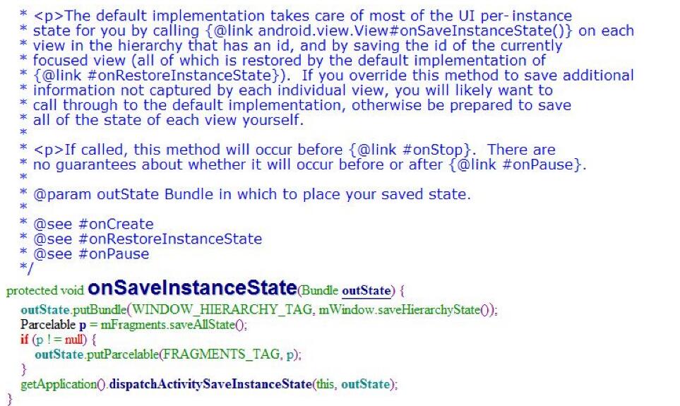 在以下場景需要臨時保存當前Activity使用的一些數(shù)據(jù)。手機橫豎屏模式切換時。用戶點擊“hom”鍵,把當前界面切換到后臺時。手機鎖屏時。從當前Activity跳到另一個Activity,但不銷毀之前的Activity時。Activity類提供了onSaveInstanceState(BundleoutState)方法保存數(shù)據(jù),onRestoreInstanceState(BundlesavedInstanceState)方法恢復數(shù)據(jù)。在使用onSaveInstanceState方法時需要注意:當用戶點擊“返回”按鈕、“返回”鍵或者調(diào)用了finish()方法退出Activity時,不會調(diào)用該方法。該方法一定是在onStop方法之前調(diào)用,但是不確定是在onPause方法之前還是之后調(diào)用。對于定義了id的視圖控件,系統(tǒng)在調(diào)用onSaveInstance方法的時候,會自動保存視圖控件的狀態(tài)。在Android源碼中,有相關說明,如圖12-1所示。