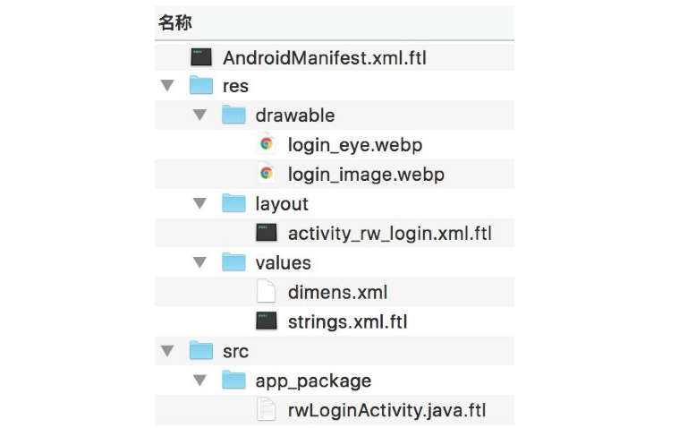 recipe.xml.ftl—用于對代碼文件和資源文件的處理。AndroidStudio提供的LoginActivity模板界面沒有圖片,rwLoginActivity模板界面有圖片,需要在recipe.xml.ftl文件中增加一個copy指令,復(fù)制模板資源圖片到工程中的資源目錄下: