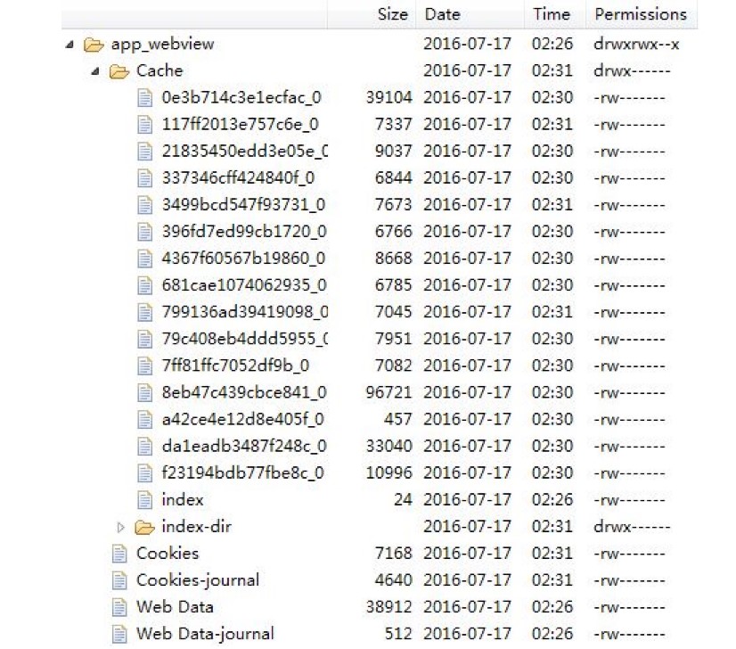 使用WebView控件加載網(wǎng)頁的時(shí)候,設(shè)置緩存模式為true,代碼如下:mWebView.getSettings().setAppCacheEnabled(true);將會(huì)在/data/data/package_name/下的app_webview文件夾里保存和網(wǎng)頁相關(guān)的數(shù)據(jù),如圖26-1所示。