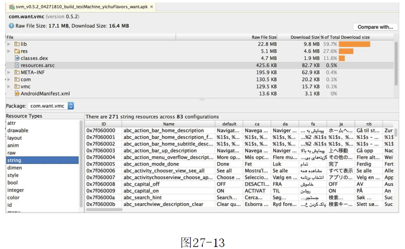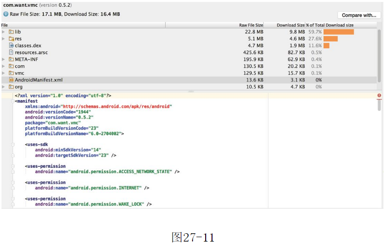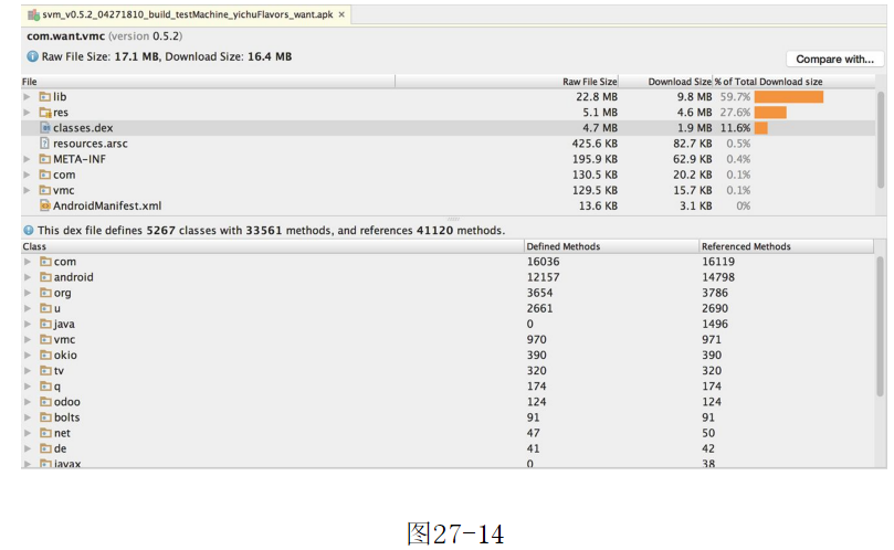 ,ReferencedMethods列是DEX文件中引用的方法個數(shù),它包含了定義的方法、依賴的library、定義在標(biāo)準(zhǔn)Java和Android庫中的方法。DefinedMethods列只包含了定義在DEX文件中的方法個數(shù)。圖27-14注意:當(dāng)引入一個依賴庫時,在依賴庫中定義的方法同時統(tǒng)計在DefinedMethods列和ReferencedMethods列中。好了,APP開發(fā)公司本文關(guān)于“制作APP怎樣查看AndroidManifest.xml?”的知識就分享到這里,謝謝關(guān)注,博納網(wǎng)絡(luò)編輯整理。[聲明]本網(wǎng)轉(zhuǎn)載網(wǎng)絡(luò)媒體稿件是為了傳播更多的信息,此類稿件不代表本網(wǎng)觀點,本網(wǎng)不承擔(dān)此類稿件侵權(quán)行為的連帶責(zé)任。故此,如果您發(fā)現(xiàn)本網(wǎng)站的內(nèi)容侵犯了您的版權(quán),請您的相關(guān)內(nèi)容發(fā)至此郵箱【qin@198bona.com 】,我們在確認(rèn)后,會立即刪除,保證您的版權(quán)。