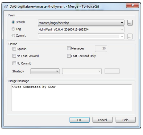 在Windows電腦上,選中工程文件。然后單擊鼠標(biāo)右鍵,選擇TortoiseGit—>Merge,顯示如圖1-3所示的界面。