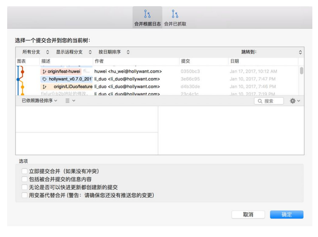 默認(rèn)是選中合并根據(jù)日志按鈕,此時(shí)可選擇合并某個(gè)Commit到當(dāng)前分支。