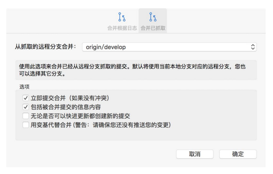 單擊SourceTree上部的合并按鈕后,顯示如圖1-4所示的界面。