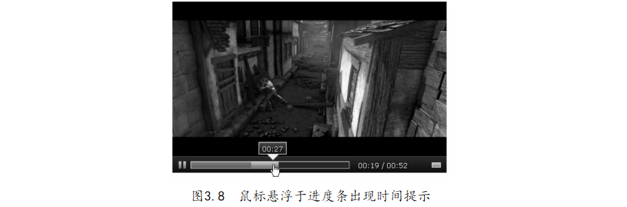 圖3.7中的藍(lán)色進(jìn)度條表示播放時間,灰色條表示視頻下載進(jìn)度。將鼠標(biāo)懸浮于進(jìn)度條之上,此時進(jìn)度條上方會出現(xiàn)對應(yīng)的時間提示框,效果如圖3.8所示。