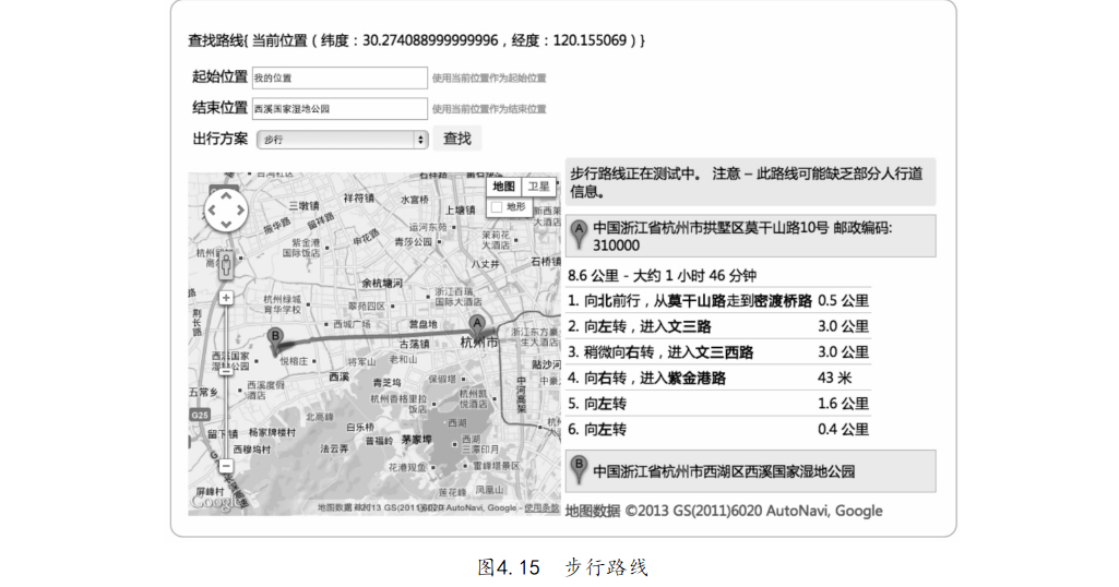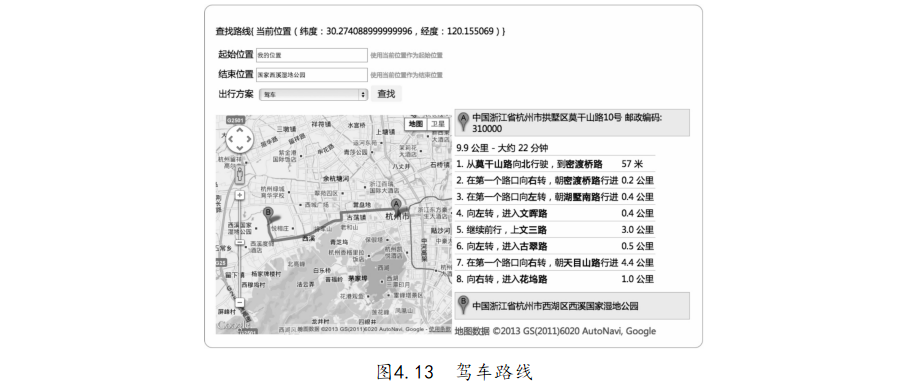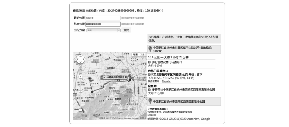 第21行<divid="directionsPannel">元素的作用是把路線查找的文字結(jié)果顯示在這里。JavaScript邏輯代碼部分如下: